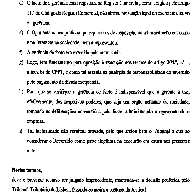 I. Pelo que, salvo o devido respeito, tendo o Oponente intervindo em representação da sociedade originária executada tomando decisões, na área comercial da qual era responsável, e assinando, como gerente, documentos necessários ao giro comercial da sociedade e vinculativos daquela perante terceiros, certo se tornava concluir pela intervenção do Oponente na gestão da devedora originária e, consequentemente, deveria o Tribunal a quo ter considerado que aquele exercia, de facto e de direito, a gerência da Sociedade;