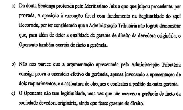 A. Vem o presente recurso interposto da Douta sentença proferida pelo Meritíssimo Tribunal a quo que julgou procedente, por provada, a oposição à execução fiscal com fundamento na ilegitimidade do Oponente, por ter considerado que a Administração Tributária não logrou demonstrar que, para além de deter a qualidade de gerente de direito da devedora originária, o Oponente também exercia de facto a gerência;