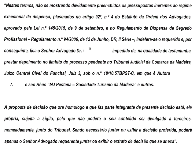 3.1. Pelo exposto, acordam em determinar o levantamento do segredo profissional, por forma que o Exmo. Dr. B preste depoimento às questões que foram supra indicadas pela ré M & J Pestana - Sociedade de Turismo da Madeira, S.A., e às demais que sejam conexas ou pertinentes, nomeadamente em termos de estabelecimento da razão de ciência.