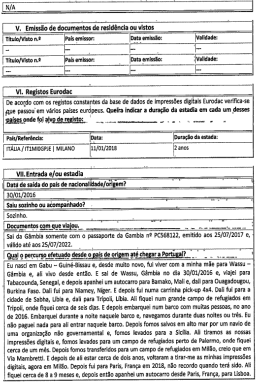 E. Aquando da prestação das declarações transcritas, o A. não foi expressamente confrontado com a provável inadmissibilidade do seu pedido e com a possibilidade de ser transferido para Itália, cfr. fls. 29 a 37 do p.a.;